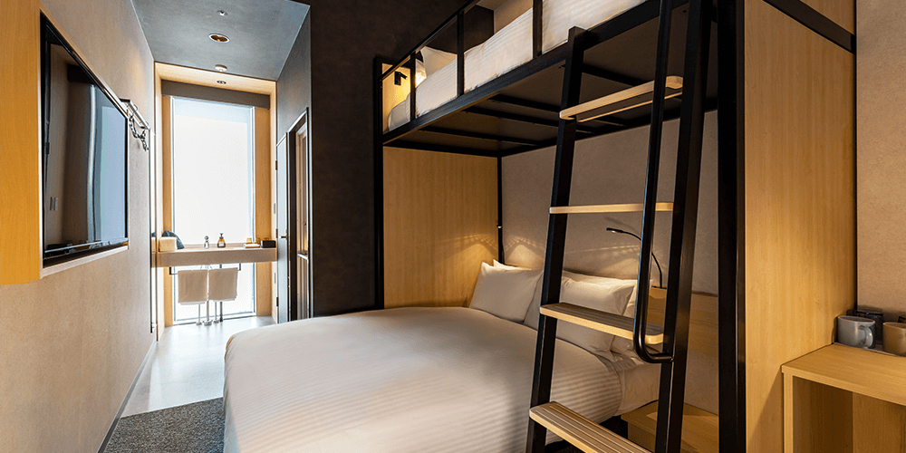 最上階12階に位置するロフトベッドを備えたコンパクトなダブルルーム。