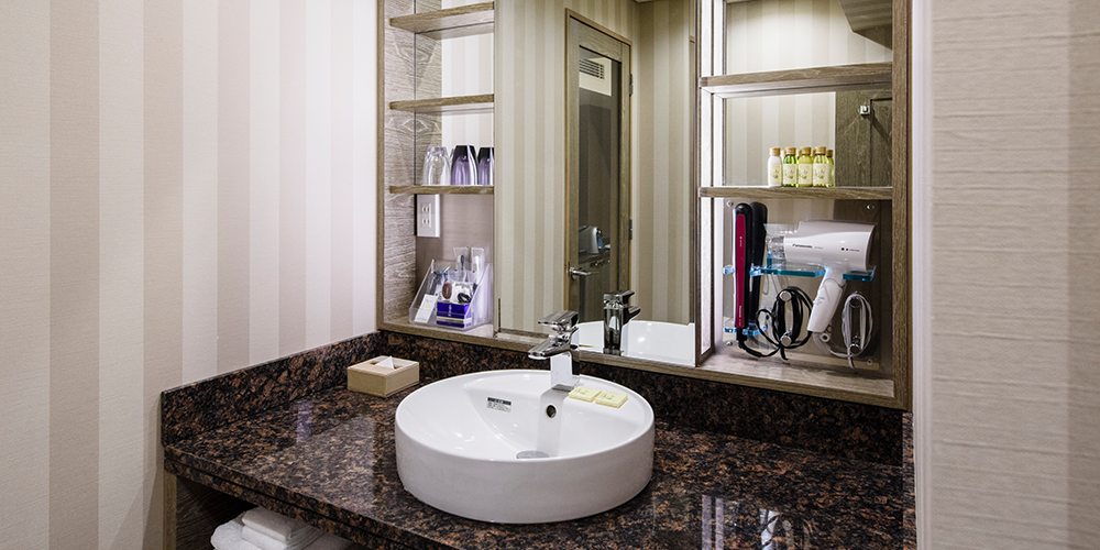 バスソルト、アイマスク、洗顔料・化粧水等嬉しいアメニティが充実。